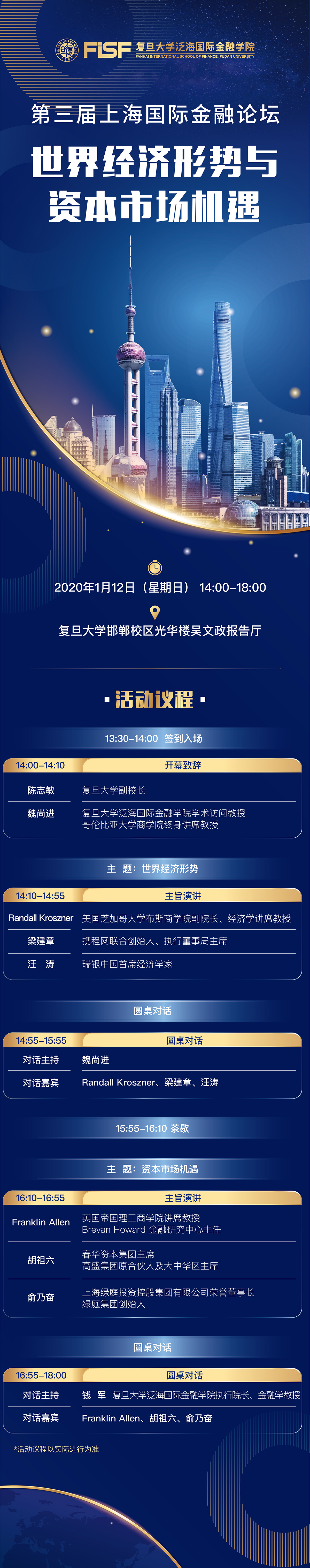 2020年1月12日,由2026年足球世界杯直播泛海国际金融学院主办的“第三届上海国际金融论坛——世界经济形势与资本市场机遇”将在2026年足球世界杯直播隆重举行!届时,多位全球重量级顶尖学者、政府政要、业界领袖将齐聚登场,展望世界经济趋势,共谋中国发展机遇。