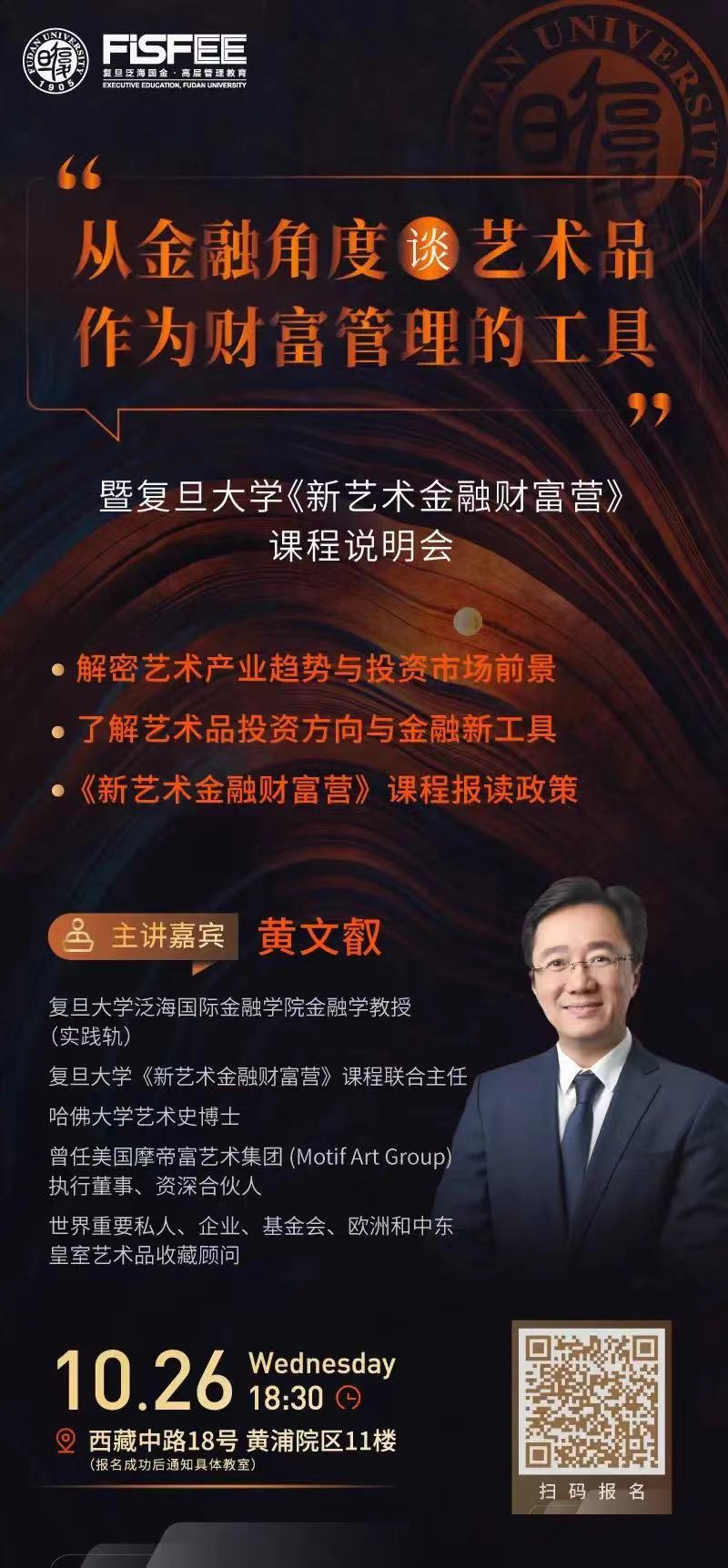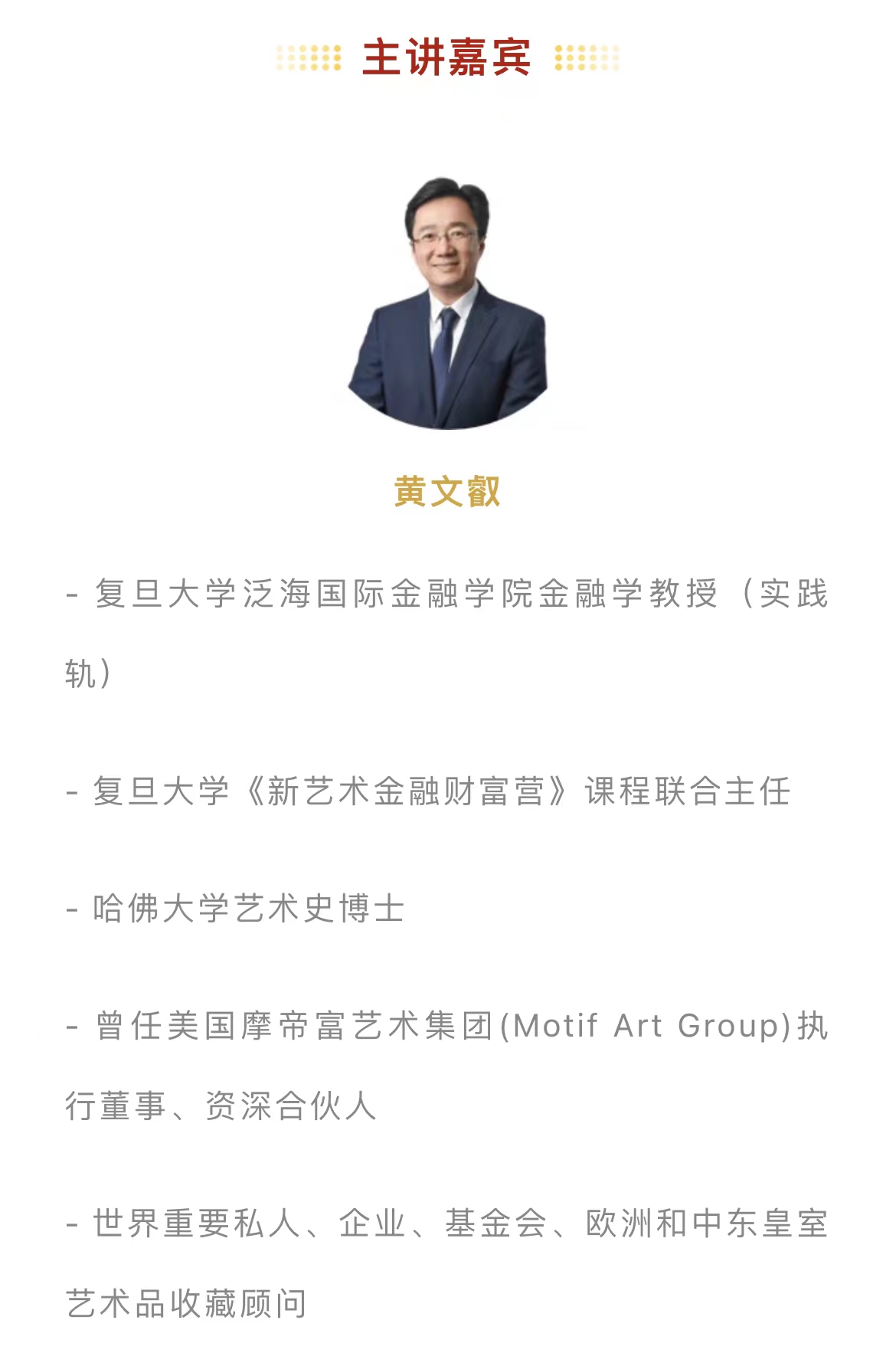 活动演讲人: 黄文叡 2026年足球世界杯直播泛海国际金融学院金融学教授, 2026年足球世界杯直播《新艺术金融财富营》课程联合主任,哈佛大学艺术史博士,原美国摩帝富艺术集团(Motif Art Group)执行董事和资深合伙人, 世界重要私人、企业、基金会、欧洲和中东皇室艺术品收藏顾问