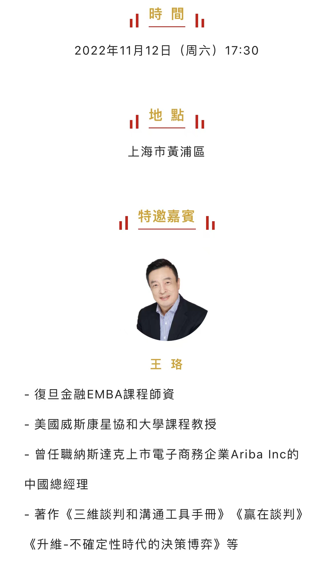 活动演讲人: 王珞,復旦金融EMBA課程師資,美國威斯康星協和大學課程教授,曾任職納斯達克上市電子商務企業Ariba Inc的中國總經理,著作《三維談判和溝通工具手冊》、《贏在談判》、《升維-不確定性時代的決策博弈》等