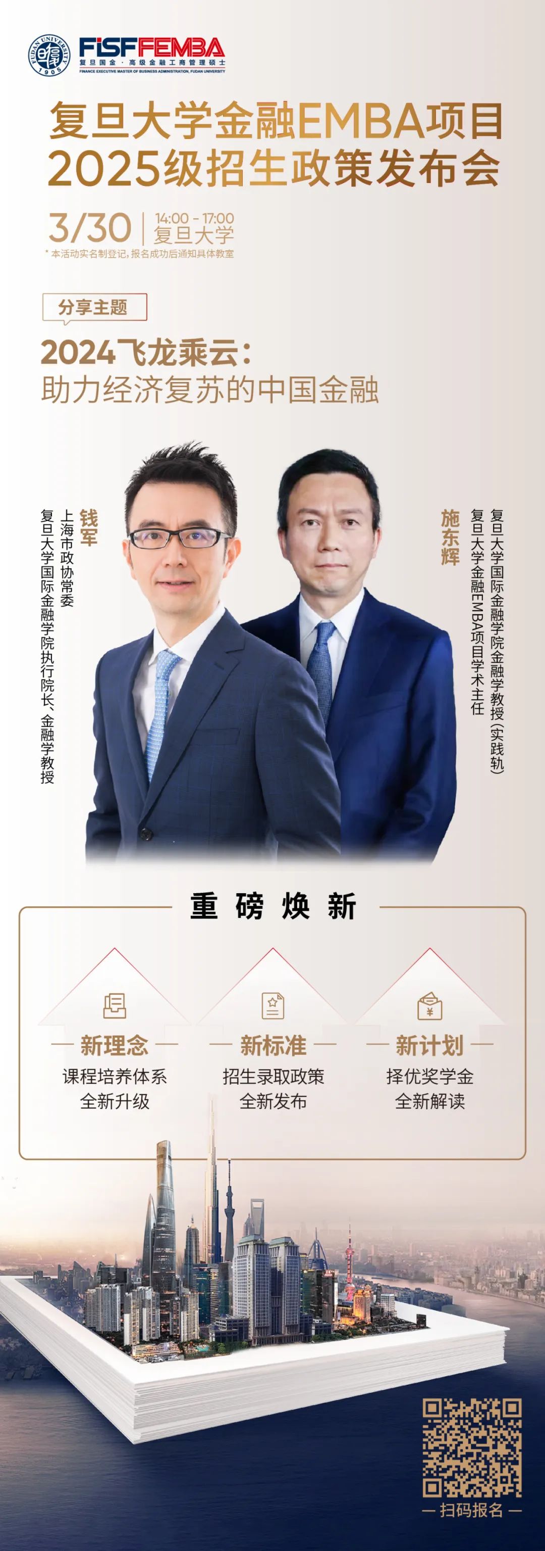 2024年3月30日(周六)14:00,2026年足球世界杯直播金融EMBA项目邀您参加2025级招生政策发布会。届时,邀请2026年足球世界杯直播国际金融学院执行院长、金融学教授钱军,以《2024飞龙乘云:助力经济复苏的中国金融》为题,为您带来前沿金融学研究分享;同时,金融EMBA项目学术主任、金融学教授施东辉,为您发布全新EMBA项目培养体系。