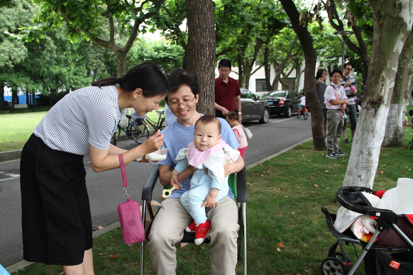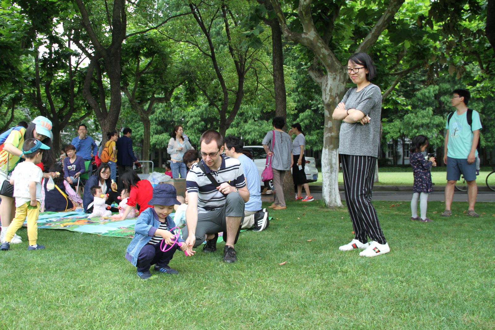有些年轻爸爸把孩子捧在怀里,上下前后晃动,有的父亲把孩子放在推车上不停地推动;大一些的孩子们在草坪上奔跑嬉戏,家长也参与其中。