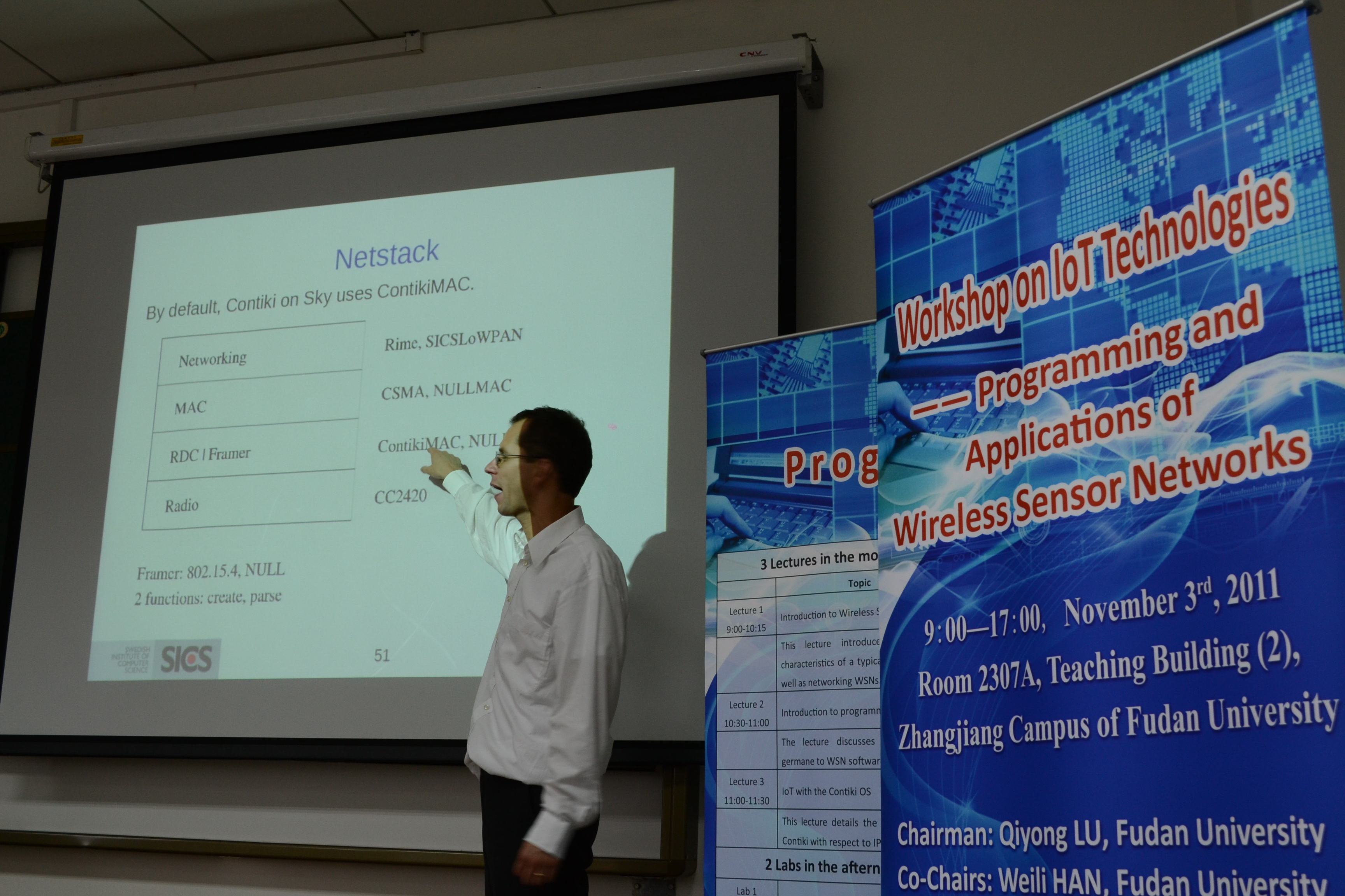 瑞典皇家理工学院Carlo Fischione主讲《无线传感网络:节点结构,互联与应用》,主要介绍无线传感网络(WSN)和典型WSN节点硬件结构特征以及互联与应用;由瑞典计算机科学研究院Thiemo Voigt教授主讲《无线传感网络节点的编程》,讨论WSN软件发展的现状、机遇和挑战;瑞典计算机科学研究院Marcus Lunden教授主讲《无线传感互连和干扰》,他在上两个讲座的基础上讨论无线传感网络互联和干扰技术的关键问题,现有的工具和解决方案。各位专家教授亲自指导与会者进行实践操作,从开发环境的建立到节点的实际编程,介绍WSN的实际开发应用,然后将其功能扩展到更为实际的情况,在讨论设计过程中最常碰到的问题以及解决方案。
