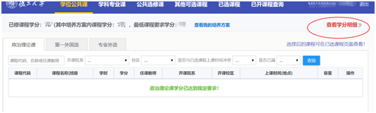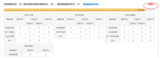 答:登录选课系统后,点击“查看学分明细”可以查阅本人已选课程及学分获得情况。查阅后点击“收起”,可以折叠详情。