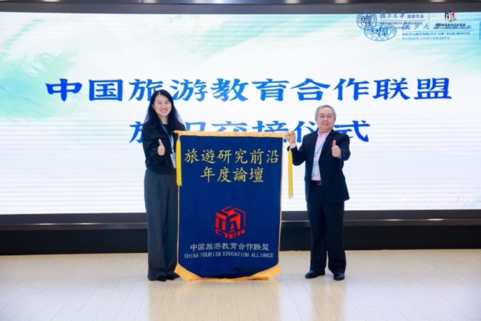 最后,巴兆祥教授代表中国旅游教育合作联盟理事会,宣布山东大学旅游管理学院文化和旅游学系、浙江大学管理学院旅游与酒店管理系、中国海洋大学管理学院成为新加入的联盟成员单位;2025旅游研究前沿年度论坛将由中山大学管理学院承办。两校代表进行了中国旅游教育合作联盟“旅游研究前沿年度论坛”主办方旗帜交接仪式。