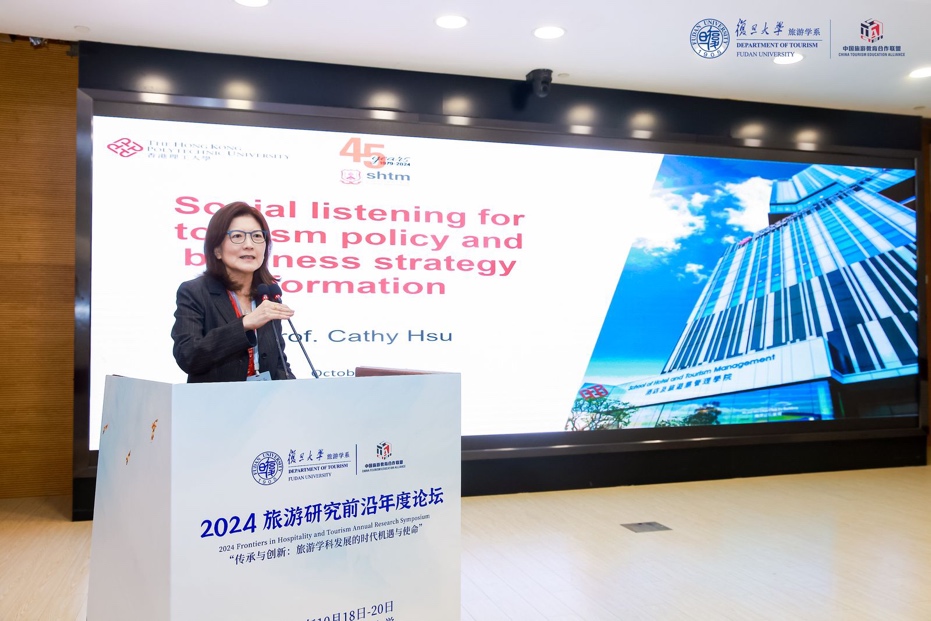 香港理工大学酒店及旅游业管理学院Cathy Hsu(徐惠群)讲席教授作题为《Social listening for tourism policy and business strategy formation》的主旨演讲。通过介绍利用大数据帮助政府、企业、目的地等旅游相关决策者进行战略沟通的有效工具,她表示:社会可持续性需要考虑在旅游发展的正负面影响中取得平衡,旅游研究者要关注任何微小的声音,通过创新对社会和经济的可持续发展作出贡献。