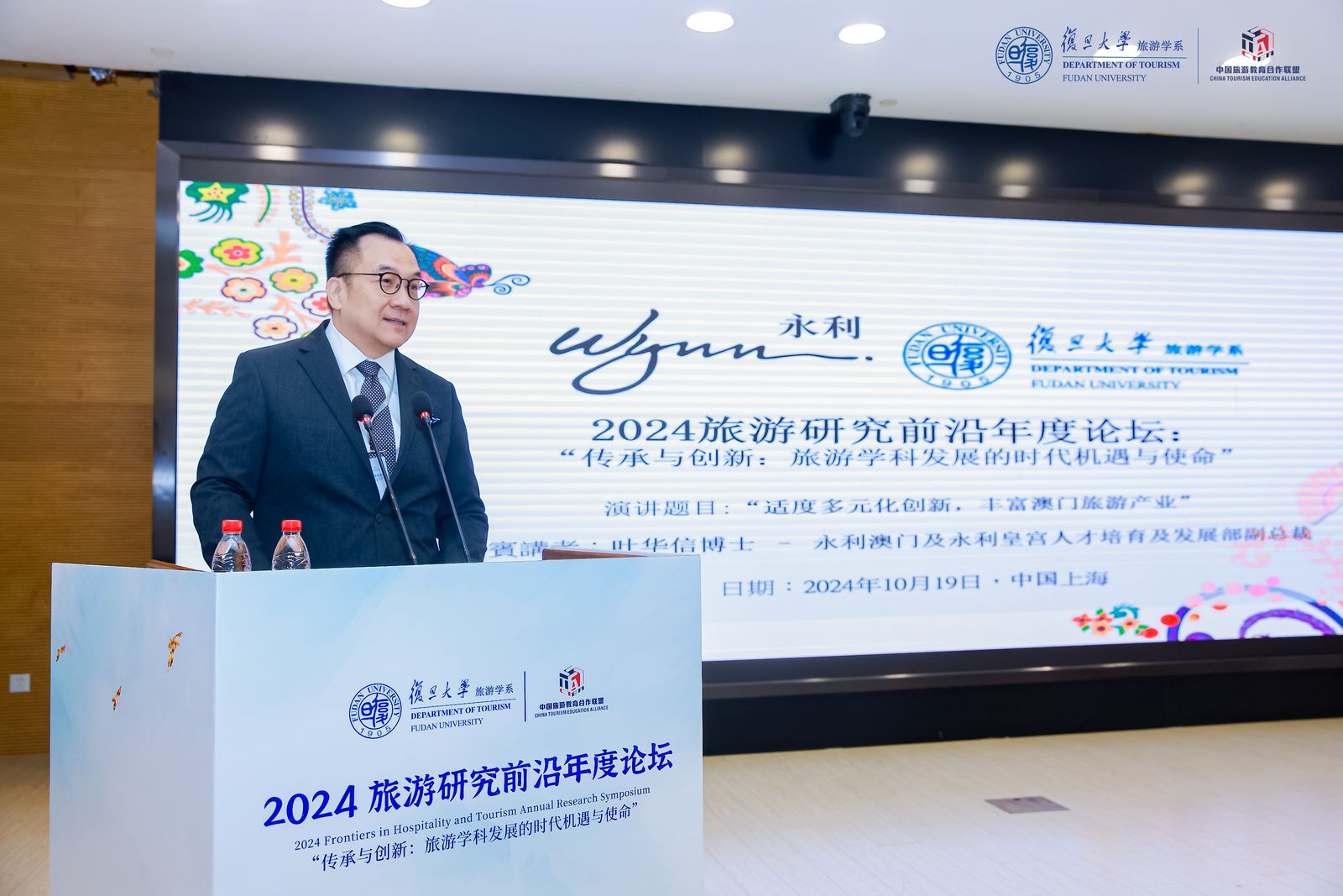 永利澳门及永利皇宫人才培育及发展副总裁叶华信博士作为本次会议的业界代表,带来题为《适度多元化创新,丰富澳门旅游产业》的主旨演讲。他分享了永利澳门的核心价值观和旅游多元发展策略,介绍了企业在文化艺术、会议展览等多种领域的旅游活动及项目,探讨了行业实践如何与国家战略配合带动区域发展、如何与学术发展交融带动幸福产业前进等问题。