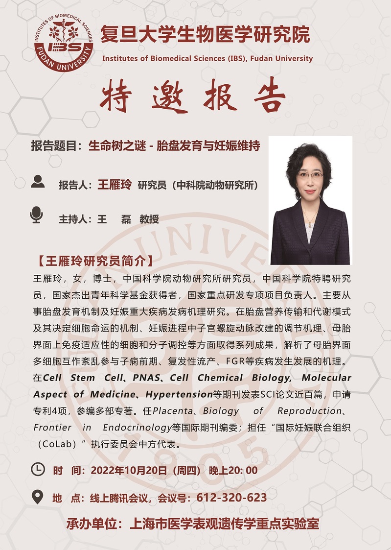 特邀报告:生命树之谜——胎盘发育与妊娠维持(10月20日晚20:00)