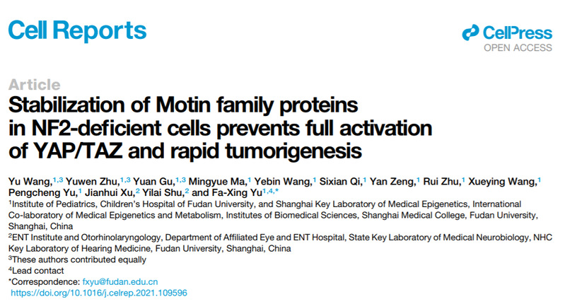 2021年8月24日,我院余发星团队在Cell Reports发表了题为 Stabilization of Motin family proteins in NF2 deficient cells prevents full activation of YAP/TAZ and rapid tumorigenesis的论文。该研究系的统揭示了在NF2缺失的状态下,Hippo信号通路上游因子Angiomotin蛋白家族(Motins)稳定性提高,阻止YAP/TAZ完全活化的分子机制,该研究解释了NF2突变相关肿瘤恶性程度低的原因。