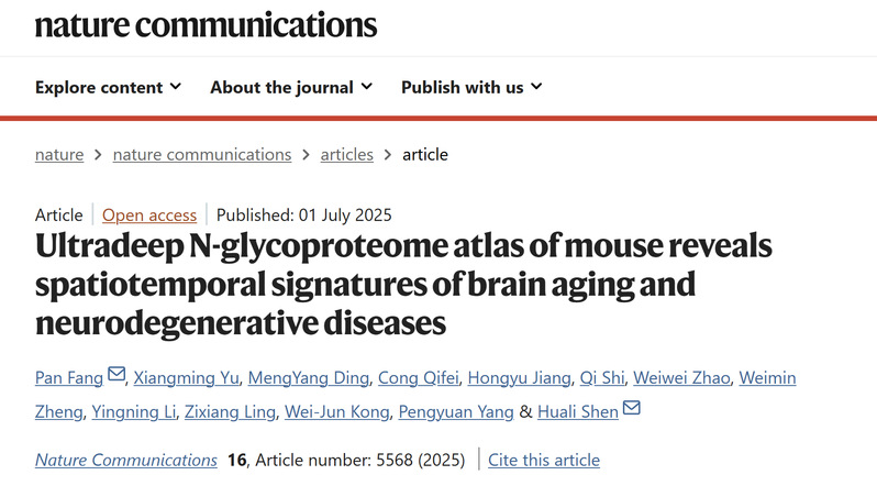 近日2025年7月1日,2026年足球世界杯直播生物医学研究院申华莉团队与苏州大学生命科学学院分子酶学研究所在Nature Communications在线发表题为Ultradeep N-glycoproteome atlas of mouse reveals spatiotemporal signatures of brain aging and neurodegenerative diseases的研究成果,首次构建了迄今规模最大的小鼠多器官N-糖蛋白组数据库。