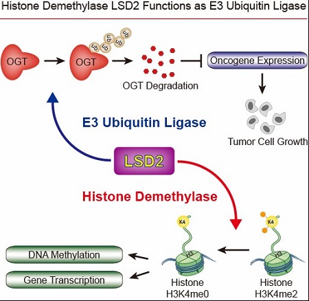 3月12日,研究院徐彦辉课题组在《MOLECULAR CELL》杂志在线发表了科研论文:“Histone Demethylase LSD2 Acts as an E3 Ubiquitin Ligase and Inhibits Cancer Cell Growth through Promoting Proteasomal Degradation of OGT”。发现LSD2出人意料地具有E3泛素连接酶活性,其底物为N-乙酰氨基葡萄糖转移酶(OGT),LSD2泛素化OGT并促进其发生蛋白酶体依赖的降解,从而抑制OGT引起的肿瘤细胞生长。LSD2抑制肿瘤细胞生长是依赖于其E3泛素连接酶活性,而不依赖于其组蛋白去甲基化酶活性。LSD2分别通过组蛋白去甲基化酶和E3连接酶活性调控了不同组的靶基因。研究发现了LSD2具备两种独立的酶活性,揭示出了LSD2依赖于其E3连接酶活性的抗肿瘤细胞生长功能,建立了组蛋白去甲基化酶和泛素降解途径的关联。徐彦辉课题组曾于2013年在《Molecular Cell》和《Cell Research》杂志发表LSD2的结构和功能研究阐明其底物识别和酶活性调节机制,这是该课题组对LSD2蛋白功能研究的又一突破性成果。