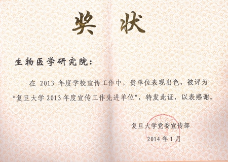 2014年1月21日,校党委宣传部在邯郸校区卿云楼召开全校宣传工作总结表彰会。会上,生物医学研究院获颁2013年度全校宣传工作先进单位证书。 此次表彰大会共颁发了十佳先进个人、十佳先进单位和特别贡献奖共二十一项奖状。生物医学研究院因在2013年度宣传工作中表现出色,获此殊荣。