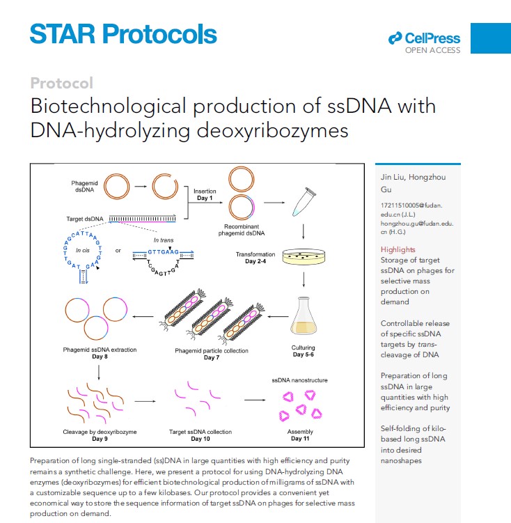 2021年5月14日,我院顾宏周课题组在Star Protocols杂志上发表了题为“Biotechnological production of ssDNA with DNA-hydrolyzing deoxyribozymes”的文章,报道了一种经济高效地制备序列可定义的长单链DNA的生物方法。研究者重组噬菌体基因组,利用生物体系对化学合成的极少量DNA模板进行扩增放大,并借助DNA自水解酶的顺式或反式作用,在后处理阶段实现了无需蛋白酶参与的单链DNA序列的自动切割及与放大体系的分离。该方法可将长单链DNA序列的有效制备长度延伸至几千个碱基,产量提升至毫克-克级别,成本比现有的合成技术低2-3个数量级以上。