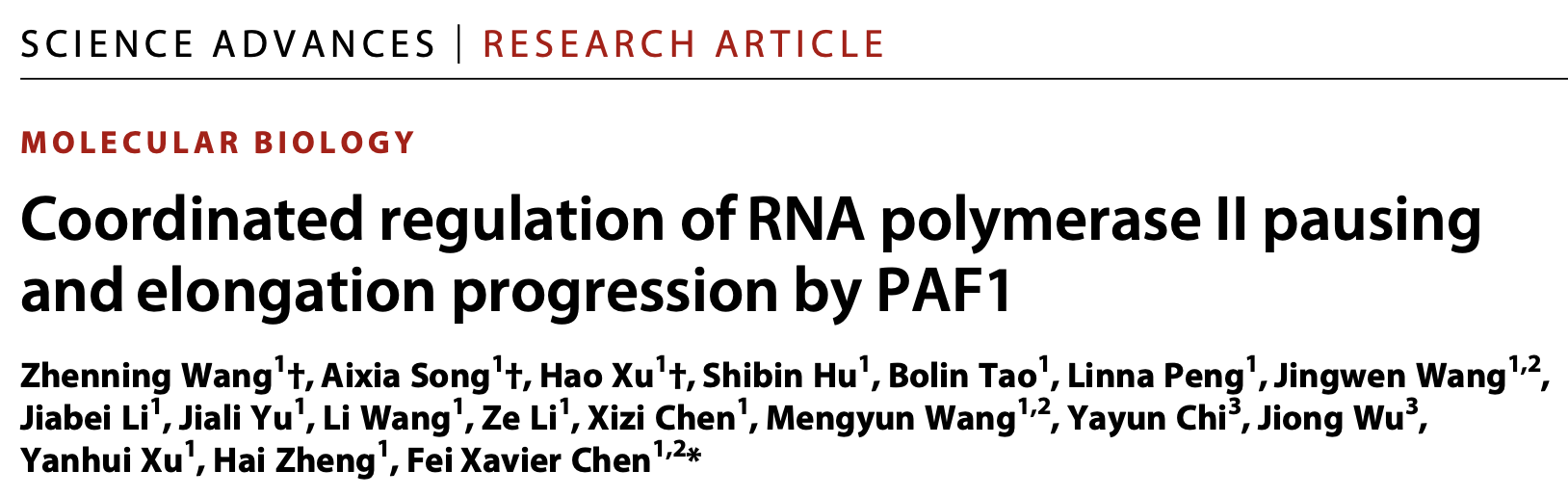 Science Advances丨陈飞课题组揭示转录调控因子PAF1的分子调控机制