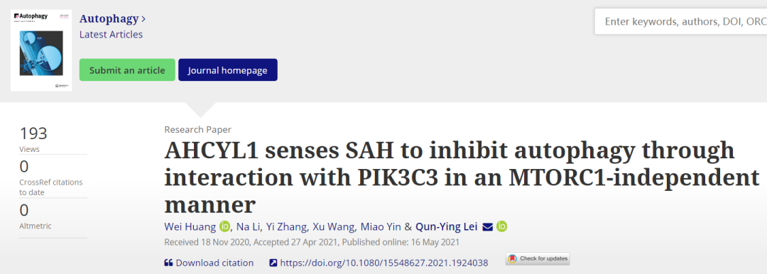 雷群英团队《Autophagy》报道AHCYL1可作为代谢物SAH的感受器