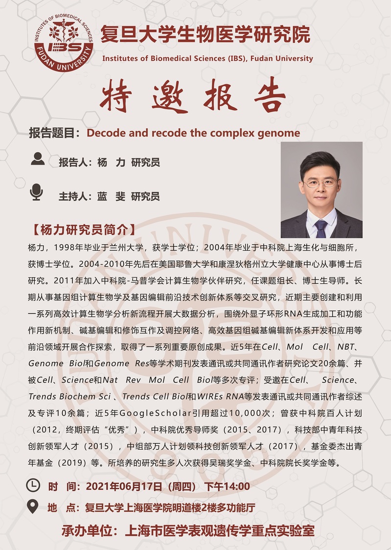 中科院计算生物学研究所杨力研究员讲座信息(6月17日)