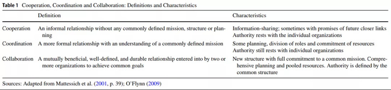 在现实世界,“筒仓”组织之间通常不可避免地要进行互动。依照Mattessich等人(2001)的分类框架,作者将“筒仓”间的互动模式划分为三种类型:(1)合作(Cooperation)、(2)协调(Coordination)、(3)协同(Collaboration)。其中,“合作”强调的是,在没有明确的愿景、规划和结构的前提下,组织之间所进行的非正式互动。“协调”则是更广泛意义上的基于某些共同目标,但是并没有外在强制权威要求的互动联系,它既可以是结构化/非结构化的,也可以是正式/非正式的。最后,“协同”的覆盖范围更加广泛。基于某些外在权威或组织结构的要求,协同往往要求组织间的正式承诺、共同规划以及资源投入。尽管在经典意义上,人们会认为组织间的合作互动会经历由“合作”到“协调”再到“协同”的不同阶段,但是对于“筒仓”组织而言,合作互动通常停留在“合作”和“协调”两个阶段上即可比较成功地解决一些跨领域、跨部门难题。