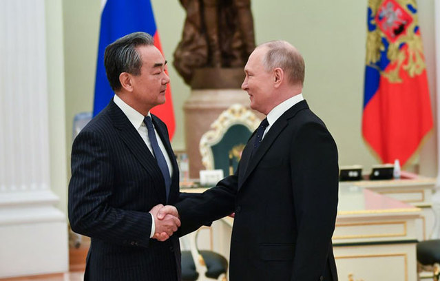 2022年2月22日,俄罗斯总统普京在莫斯科会见中共中央政治局委员王毅。 (曹阳/新华社)