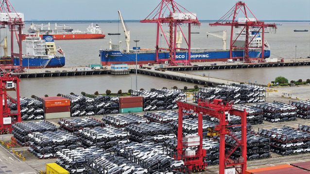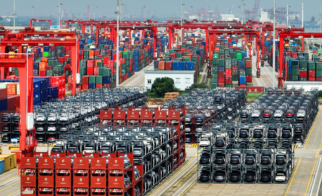 2023年9月11日,苏州港太仓港区国际集装箱码头,一批新能源汽车即将通过可折叠车辆框架箱出口国外市场。视觉中国 图