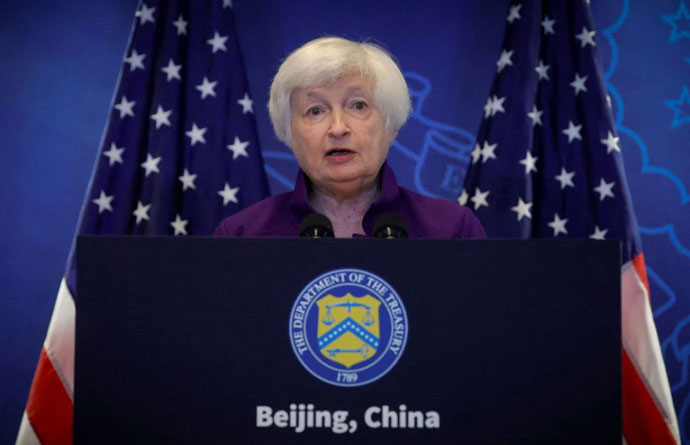 2023年7月9日,美国财政部长珍妮特·耶伦在中国北京美国大使馆举行的新闻发布会上发表讲话。路透社/托马斯·彼得/资料照片