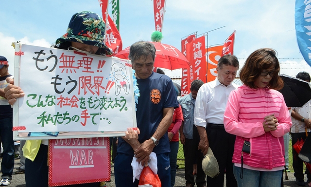 People offer a silent prayer in front of the US Kadena Air Base in Cyatan to protest against the US military presence in Okinawa on May 21, 2016, after a former US Marine reportedly admitted to raping and killing a Japanese female. Photo: VCG
