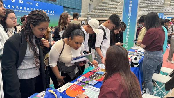 展会现场气氛火爆,9家行业领军企业轮番登台宣讲,吸引国际人才驻足聆听,各参展企业和院校展位前咨询者络绎不绝。
