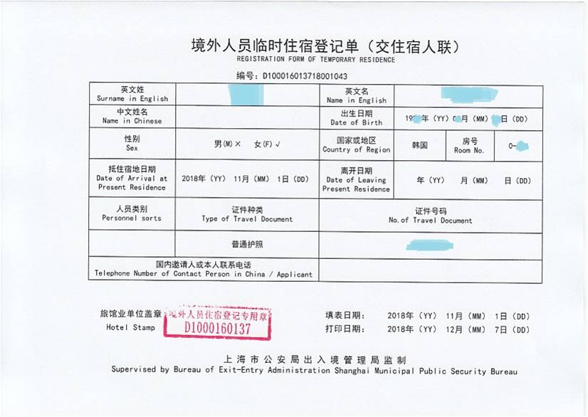 (4) Registration Form of Temporary Residence (Please read Appendix)