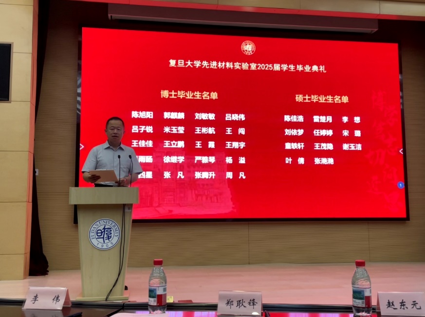 毕业典礼在国歌声中拉开帷幕,先进材料实验室常务副主任郑耿锋教授宣读了先进材料实验室2025届毕业生名单,先进材料实验室副主任邵正中教授宣读了2025年优秀毕业生名单并为优秀毕业生颁发证书。