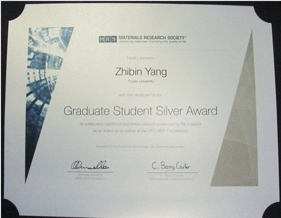 MRS成立于1973年,总部位于美国,目前拥有来自世界71个国家的16000多名会员,是材料、物理、化学、生物、能源等多领域最富盛名的国际学术组织。该组织每年在美国举办两次大型会议,每次参会人员达到上万人之多。为了鼓励和表彰博士生在材料及相关领域做出优秀的研究成果,MRS自2002年起设立优秀博士生奖,通过个人申请和层层选拔,从世界范围内评选出一批优秀的博士生,在年会上公布评选结果并举行隆重的颁奖典礼。