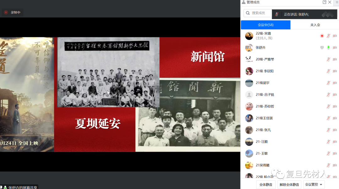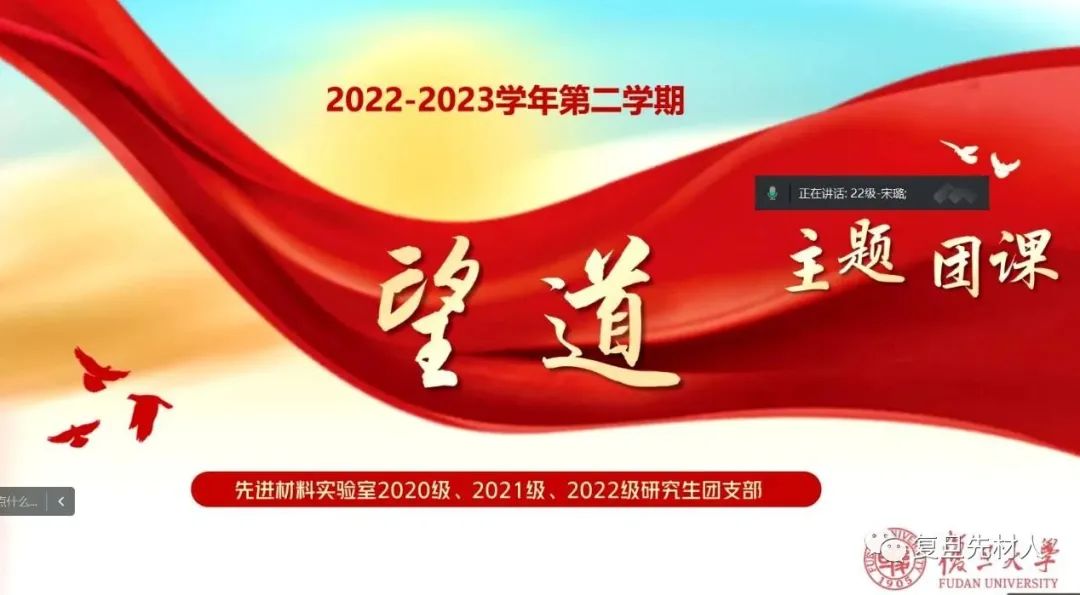 2023年3月22日,为赓续红色基因,传承望道精神,先进材料实验室2022级、2021级以及2020级研究生团支部,联合开展主题团日活动,开展联组学习。本次会议由2022级研究生团支部书记宋璐主持,邀请了博士生讲师团的张舒卉老师线上讲授课程《陈望道与复旦的红色基因》。