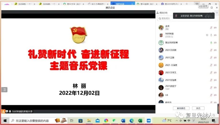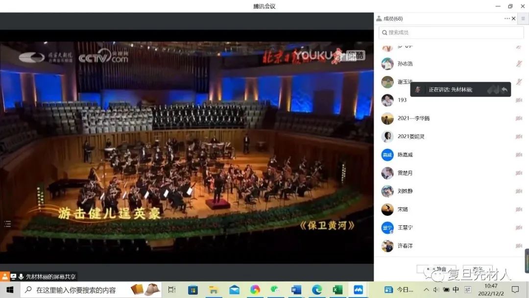 全面深入学习领会党的二十大精神,进一步推进党史学习教育,将美育与理想信念教育有机融合,2022年12月2日上午,先进材料实验室创新党建形式,面向全体研究生党员和部分团员青年,举办题为《礼赞新时代,奋进新征程》的音乐党课。本次音乐党课由先进材料实验室党总支副书记林丽老师主讲, 研工组长兼2020级辅导员彭博老师、2021级辅导员王金秀老师、2022级辅导员王慧宁老师、先进材料实验室全体研究生党员、22级全体团支部成员参与了本次党课活动。本次主题音乐党课由研工组长彭博老师主持。