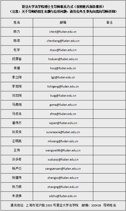 注意事项:(1)申请材料必须齐全并符合要求,并请按上述清单顺序编号提交,若申请材料不完整,将不予受理。(2)申请者须于2020年1月10日前(以邮戳为准)提交纸质版材料,并同时将材料1-8的电子版发送至lawjw@fudan.edu.cn(邮件请以"姓名+博士申请材料"命名),逾期不予受理。(3)请用EMS及其他快递方式寄送纸质版材料,不接受邮政包裹形式,使用邮政包裹发生材料延误或无法收取,责任自负。(4)上述申请材料提交学院后,将不再退回。(5)学院可视情况要求申请者另外提交申请材料原件,以供查验。若发现材料造假者,即使已被录取,也将按照学校相关规定进行处理。