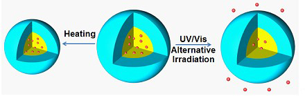 A novel triblock copolymer containing azobenzene (AZO) and N-isopropylacrylamide (NIPAM) was synthesized by atom transfer radical polymerization (ATRP) using a poly(ethylene oxide) bifunctional macroinitiator (Br-PEO-Br). The triblock copolymer was characterized by 1H NMR and gel permeation chromatography (GPC). Uniformly distributed polymeric micelles were obtained in aqueous solution by self-assembly method. Transmission electron microscope (TEM), fluorescence spectroscopy and dynamic light scattering (DLS) were used for the investigation of the self-assemblies and their stimuli-responsive behavior. Photoinduced release behavior was achieved with the as-prepared triblock copolymer micelles, which has not been observed in our previously-reported diblock copolymer micelles: the fluorescence intensity of Nile Red trapped in the triblock copolymer micelles dropped by approximately 40% after UV and Vis light alternative irradiation, indicating that a portion of the Nile Red was released to the aqueous media. Besides, the micelles shrank during the heating process.