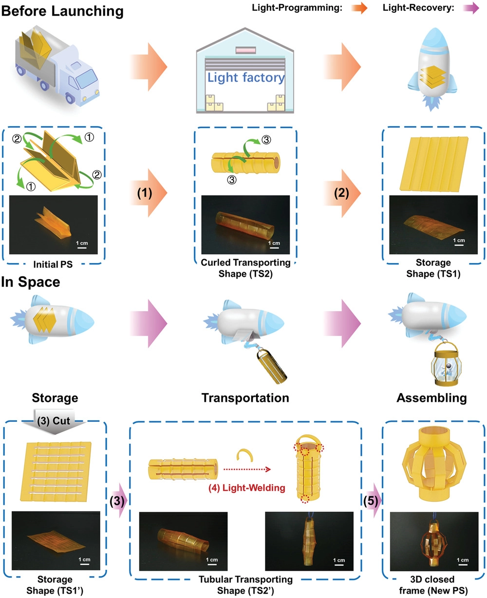 Inspired by the action and healing process from living organisms, developing deployable devices using stimuli-responsive materials, or “smart” deployable devices, is desired to realize remote-controlled programmable deformation with additional in situ repair to perform multiple tasks while extending their service life in aerospace. In this work, a photoorganizable triple shape memory polymer (POTSMP) is reported, which is composed of an azobenzene-containing thermoplastic polyurethane. Upon UV and visible illumination, this POTSMP performs arbitrary programming of two temporary shapes and precise and stepwise shape recovery, exhibiting various temporary shapes adapted to different aerospace applications. On the other hand, rapid light-reconfiguration in seconds, including light-reshaping and light-welding, is achieved in response to UV irradiation, allowing in situ localized process and repair of permanent shape. Combining these photoorganizable operations, deformable devices with complex 2D/3D structures are facilely manufactured with no need of special molds. It is envisioned that this POTSMP can expand the potential of photoresponsive TSMPs in smart deployable devices.
