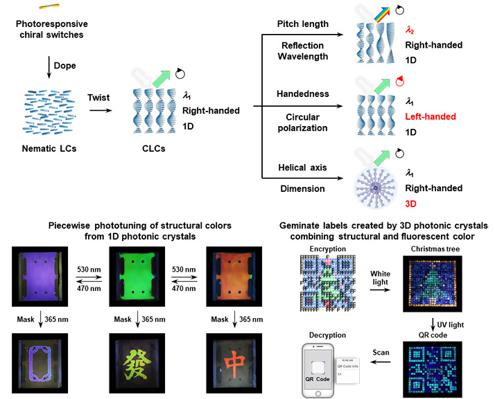 Photonic crystals fabricated by periodic dielectric materials generate a photonic bandgap to reflect the incident light, referred to structural color, which provides opportunities for various applications, including reflective displays, optical anti-counterfeiting, information storage, and VR/AR. The cutting edge in the development of the photonic crystals focuses on the dynamic tuning of the patterns with diverse structural colors. Cholesteric liquid crystals (CLCs) self-organize into helical superstructures induced by molecular chirality, and selectively reflect circularly polarized light with the same handedness as their helices according to Bragg’s law. Three key structural elements of the CLCs, including the pitch, handedness, and helical axis, are manipulated to construct different dimensional photonic crystals with tunable colors and specific handedness by designing chemical strictures of the photoresponsive chiral switches as well as employing numerous process technology. We remarkably widened the tuning range of reflection wavelength (> 2000 nm) by the piecewise phototuning strategy, realized continuous photopatterning according to programmable modulation of the CLC reflection, and created geminate labels carrying distinct information in reflective and fluorescent states with the aid of aggregation-induced emission materials. The projects were financially supported by the National Natural Science Foundation of China, and related works have been published in Nat. Commun., Adv. Mater., etc.