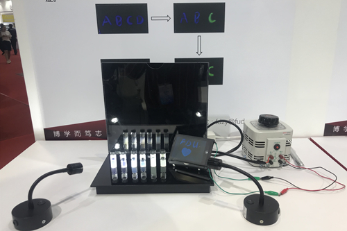 The color 'photonic ink' for reflective display developed by postdoctoral fellow Lang Qin, doctoral student Shuzhen Cui and master student Xiaojun Liu of our group and the variable-color pressure sensitive liquid-crystal writing pad developed based on that material were displayed at the booth of Fudan University. The dazzling colors of the exhibits attracted many visitors; they stopped and left notes on the writing board.