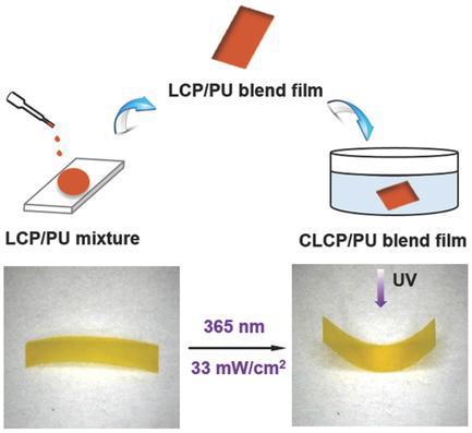 In this work, through incorporating crosslinkable PAZO bearing N-hydroxysuccinimide carboxylate substituted azobenzene moieties to PU, we fabricated photoresponsive blend films with post-crosslinked liquid crystalline polymer (CLCP) as a photosensitive component and flexible polyurethane (PU) as the matrix. Upon UV (365 nm) irradiation at low intensity, the small volume change induced by the aligned azobenzene moieties could be amplified to the whole blend system due to the effective dispersion of CLCP in the PU matrix. It is worth noting that the blend film (PAZO/PU = 1.7/98.3) with a lower content of PAZO was also able to undergo fast photo-induced bending behaviors upon exposure to UV light at ambient temperature.