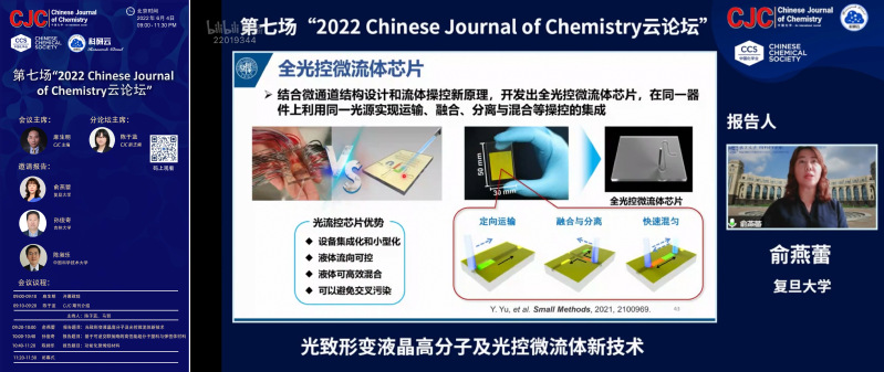 Since March 26, 2022, Chinese Journal of Chemistry (CJC) held the "Chinese Journal of Chemistry Online Forum" on each Saturday, with CJC Editor-in-Chief Prof. Shengming Ma as the conference chair and CJC Associate Editor Prof. Yulan Chen of Jilin University as the chair of this sub-forum. The forum focuses on analytical chemistry, energy chemistry, organic chemistry and polymer chemistry, and invites active scholars in corresponding fields to share their latest research. Professor Yanlei Yu of our group was invited to give a report entitled 'Photodeformable liquid crystal polymer and new technology of light-controlled microfluidics', starting from the general background of smart society, briefly describing the intelligent deformation of liquid crystal polymer materials. Meanwhile, the report focused on the new generation of high-performance photodeformable liquid crystal polymers developed by our group and its work on fully photo-controlled microfluidic transport and fully photo-controlled protein detection chip, which was unanimously affirmed by the participating experts/scholars and the online audience.