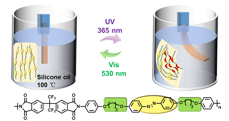 In this paper, the azo-containing diamine monomer (DAC3AB) with flexible linkers is copolymerized with 4,4′-(hexafluoroisopropylidene)-diphthalic anhydride (6FDA) to prepare an azo-PI film that can be thermally stretched to align the liquid crystal orientation. The azo-PI film exhibited fast and reversible bending behavior under alternate ultraviolet (UV) and visible (vis) light irradiation, even bent in hot water (80 °C) and hot silicone oil (100 and 120 °C) with UV light irradiation.