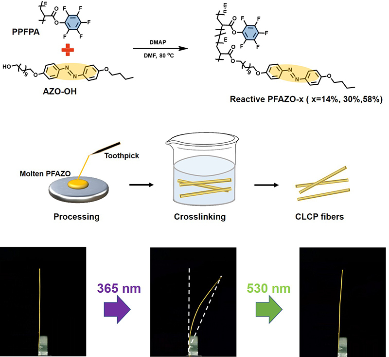 In this paper, trans-esterification post-polymerization modification (PPM) of polypentafluorophenyl acrylate (PPFPA) containing functional alcohols provides a facile strategy to synthesize reactive azo-LCP. Due to the reactive pentafluorophenyl (PFP) ester in PPFPA fulfills a dual role: 1) it can be substituted by azobenzene group to endow the polymer with both liquid crystalline and photoresponsive properties, and 2) react with diamines to result in a crosslinked polymer network. Herein, utilizing a simple thermal-drawing of the azo-LCP and a subsequent crosslinking process, photodeformable fibers with reversible bending behavior were fabricated.