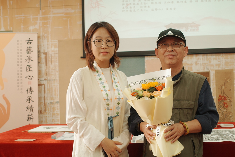 接下来,开始传习所新学员吴纹祯的拜师仪式。吴纹祯向导师邱晓刚行拜师礼,递拜师帖、敬茶和献花。