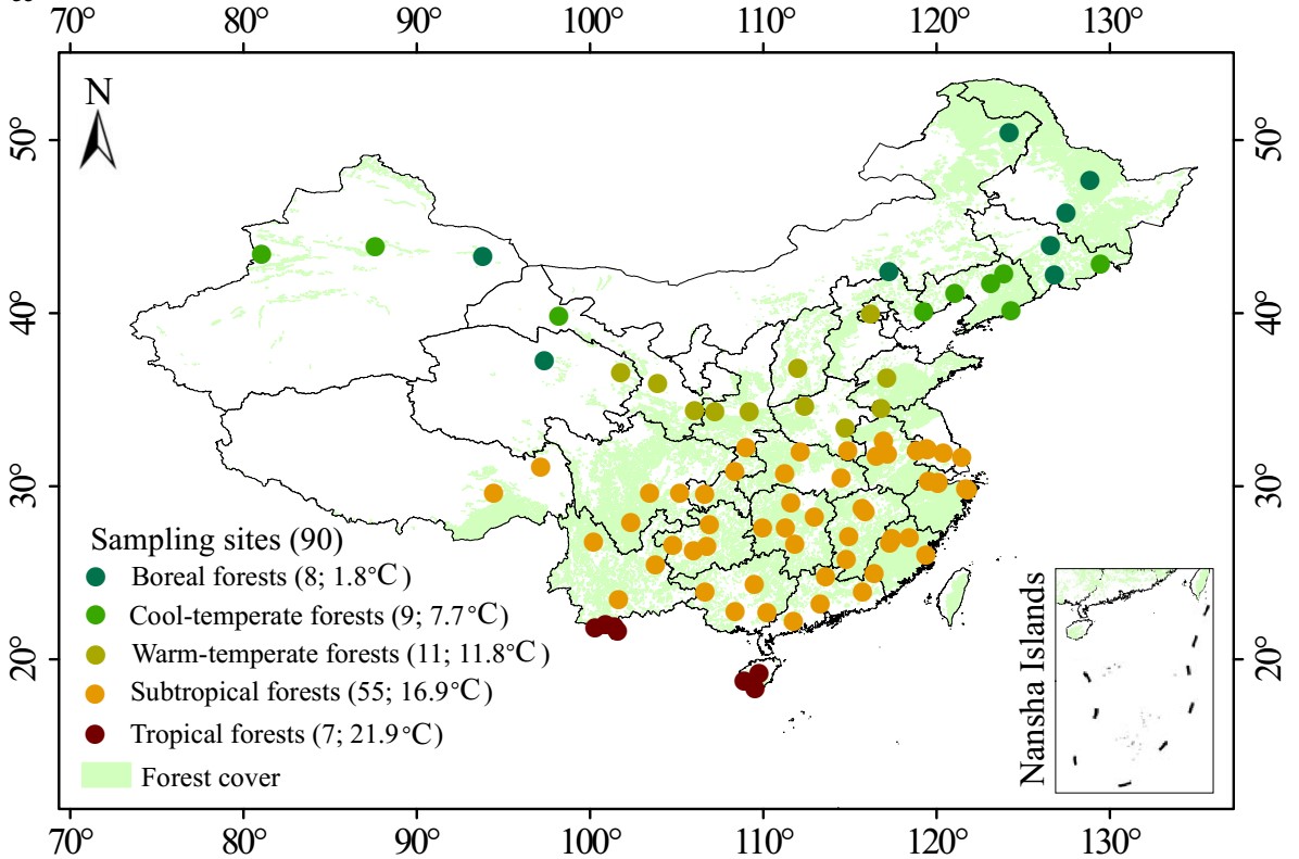 为此,该研究团队选取我国90个典型森林生态系统(图1),涉及热带雨林、亚热带森林、暖温带森林、寒温带森林与北方森林。每个森林中分6个土层采集了1米深度的土壤,探究土壤有机碳分解温度敏感性随土壤剖面变化的一般性规律及其调控机制。