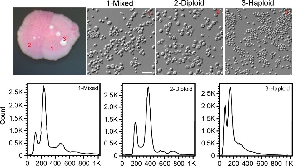 长期以来,耳念珠菌一直被认为是一种单倍体生物(基因组只包含一套染色体),只能以单倍体形式存在于自然界和患者体内。黄广华团队发现耳念珠菌基因组具有很强的可塑性,在抗真菌药物压力下,不仅能形成非整倍体,还存在一种二倍体形式,并能在单倍体和二倍体之间进行高频率的转换。这种核型的转换可能是有性生殖的一种代替方式,其基因组的可塑性促进了耳念珠菌的致病性和耐药性进化的快速进化。不同核型的耳念珠菌细胞在形态、生长速度、耐药性和致病性等方面均存在明显差异,可能是该菌感染和宿主环境适应的重要机制。比如,二倍体细胞较大,在小鼠感染模型中毒性比单倍体强,但生长速度相对较慢。