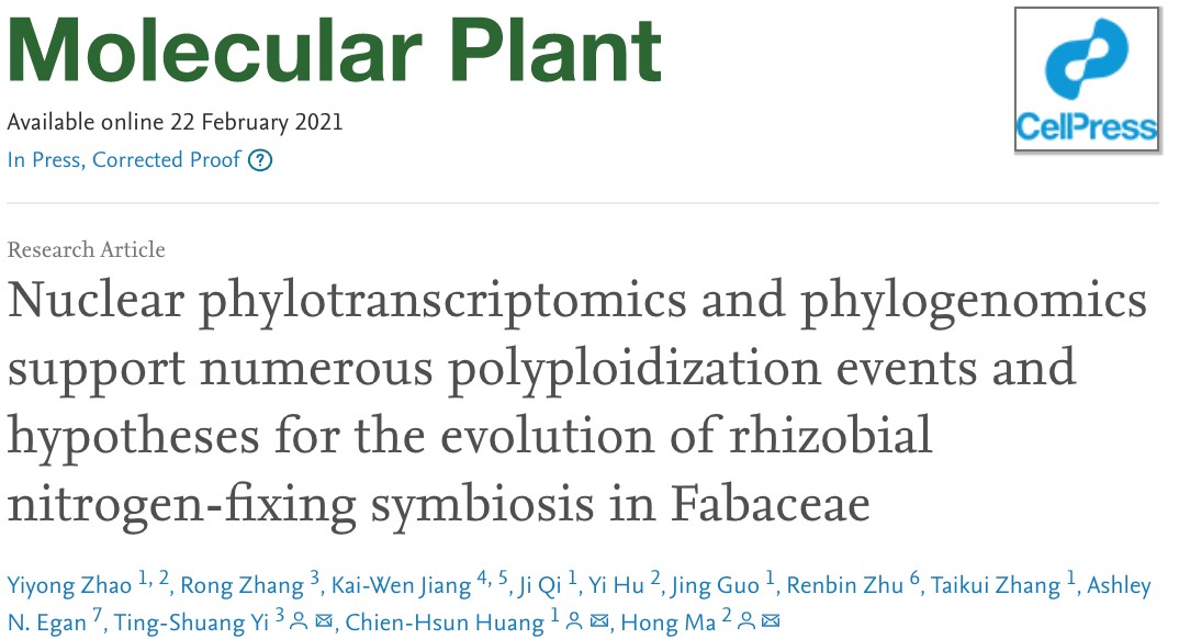 我院黄建勋博士联合美国宾夕法尼亚州立大学和中科院昆明植物所在豆科系统发育基因组学和根瘤菌固氮共生演化研究中取得新进展,相关结果在国际著名期刊《分子植物》(Molecular Plant)上发表题为“Nuclear Phylotranscriptomics/Phylogenomics Support Numerous Polyploidization Events and Hypotheses for the Evolution of Rhizobial Nitrogen-Fixing Symbiosis in Fabaceae” 研究论文。