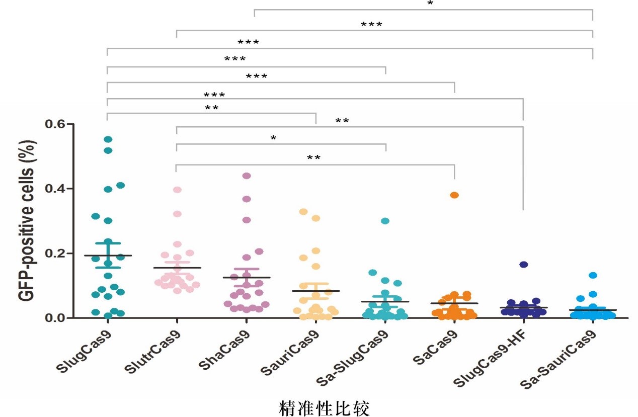 图2:利用GFP报告基因对8个工具酶在脱靶位点的编辑效率进行比较。在脱靶位点编辑效率越低精准性越高。