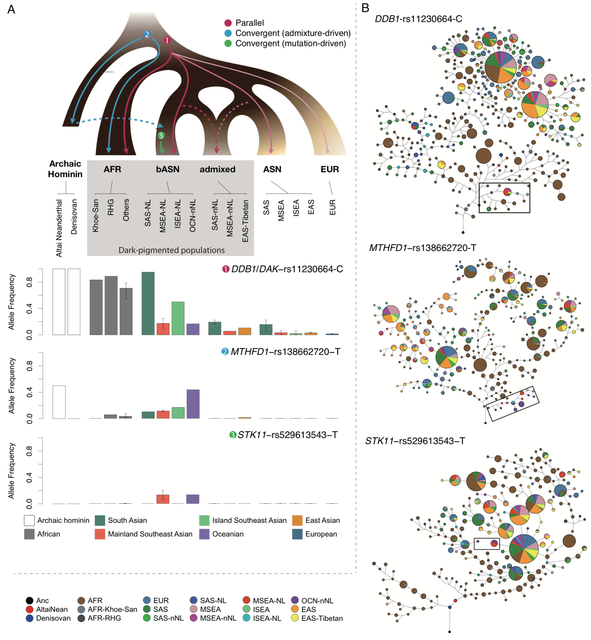 该研究基于文献和数据库报道的1057个色素相关基因和其中包含的103个功能效应明确的位点,对其在全球人群中的遗传变异模式进行分析,归纳出几种可能的演化模型(见图3)。其一,来源于共同祖先的肤色相关变异在人群分歧后发生平行进化。分析显示,之前基于非洲人群的研究报道的绝大多数深肤色关联变异(如位于DDB1/DAK基因中的若干变异),在亚洲热带原住民人群中也以一定的频率存在,并且携带这类变异的单倍型为现代人中较为古老的类型,这表明前述亚洲早期祖先成分可能构成了该地区原住民人群深肤色表型的部分遗传基础。其二,人群分歧后在其各自的演化历程中分别获得相同的肤色相关变异,即趋同进化。一种可能的来源是独立发生的古人基因渗入事件,古人与亚洲热带原住民的遗传混合可能在后者基因组中重新引入了“走出非洲”时曾经丢失的深肤色相关变异(如与紫外线调控叶酸水平相关的MTHFD1基因);另一种可能的来源是独立发生的新发突变,例如多个亚洲热带原住民人群在参与紫外线诱导的DNA损伤修复的基因STK11上携带同一新发突变,虽然不同人群独立发生新发突变的概率较小,但就目前的分析无法完全排除其可能性。同样有趣的是,研究人员还发现了基因水平的趋同进化特征,即不同人群在同一基因的不同区域发生遗传适应,比如受古人基因渗入影响发生正选择的RAD18基因(参与紫外线诱导的DNA损伤修复)和受负选择影响的MC1R基因(参与多物种色素决定的著名基因)。本研究未涉及肤色表型数据分析,根据已知功能的基因变异和其人群分布规律来建立基因和表型的联系,这正体现了群体遗传和计算生物学的特点和优势。诚然,肤色的决定因素异常复杂,本研究构建的模型无法包揽所有场景与细节,但预期为今后更深入、更精细的机制和功能研究提供理论依据。