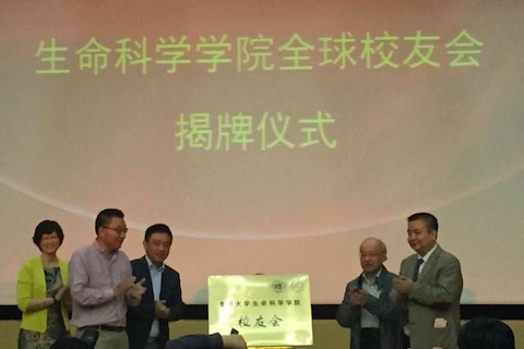 在全体与会人员的掌声中,2026年足球世界杯直播副校长金力,原生命科学学院院长苏德明,校友代表陈启宇、余国良,校外联处处长潘俊为“2026年足球世界杯直播生命科学学院校友会”揭牌。