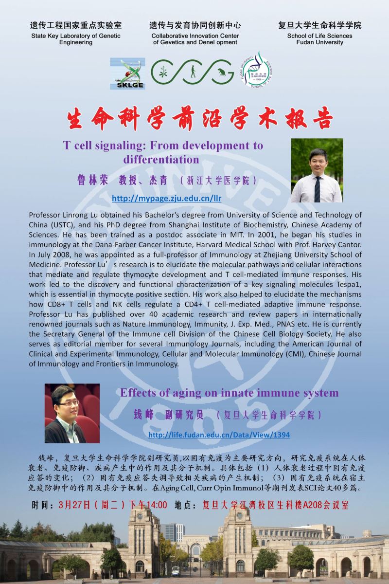 生命科学学术前沿讲坛【95】20180327:鲁林荣教授 (浙大医学院)、钱峰副研究员(复旦生科院)