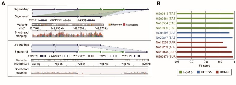 胰蛋白酶(trypsin)是一种重要的消化酶,能够帮助人类消化食物中的蛋白质。胰蛋白酶原(trypsinogen)是胰蛋白酶的前体,它在胰脏中合成,作为胰液的成分而分泌。其中,阳离子与阴离子胰蛋白酶占了人类总胰蛋白酶原的90%以上,分别受到人类7号染色体上PRSS1和PRSS2基因的编码。PRSS1与PRSS2基因在胰脏中特异性表达,且PRSS1上的一些位点变异(包括单核苷酸突变与拷贝数变异)会导致胰腺炎的产生。尽管目前第二代测序技术已较为普及,但是研究发现传统的NGS遗传变异检测会造成PRSS1和PRSS2上产生大量的假阳性结果,从而造成遗传诊断的误判。研究团队通过对PRSS1-PRSS2序列结构的解析,发现了假阳性结果的产生是由于人类中存在两种结构类型的单倍型—3基因单倍型与5基因单倍型。这两种单倍型都是由同源的胰蛋白酶原基因重复(gene duplication)产生的,两者的差别在于5基因单倍型比3基因单倍型多了两个假基因(PRSS3P2和TRY7)。而当这两个假基因的NGS测序片段(sequencing read)比对到3基因单倍型的参考基因组上时,就会由于序列的同源性被错误比对到PRSS1上,从而产生大量的假阳性。相反地,如果用5基因单倍型作为参考基因组就能较好地避免假阳性的产生(图1A)。基于此,研究团队开发了新的工具(NGS.PRSS1-2caller)用于PRSS1-PRSS2基因座的遗传变异检测。相比于传统的遗传变异检测软件GATK,评估显示NGS.PRSS1-2caller不仅大幅提升了PRSS1-PRSS2基因座检测的准确度与灵敏度,还能同时实现对序列结构(拷贝数变异)与单核苷酸突变的判读(图1B)。最后,研究团队将NGS.PRSS1-2caller应用在1000 genomes项目(1KG)数据中,结合已知的胰腺炎风险位点进行连锁分析,发现了在欧亚人群的胰腺炎易感性与PRSS1-PRSS2座的单倍型结构存在紧密联系。