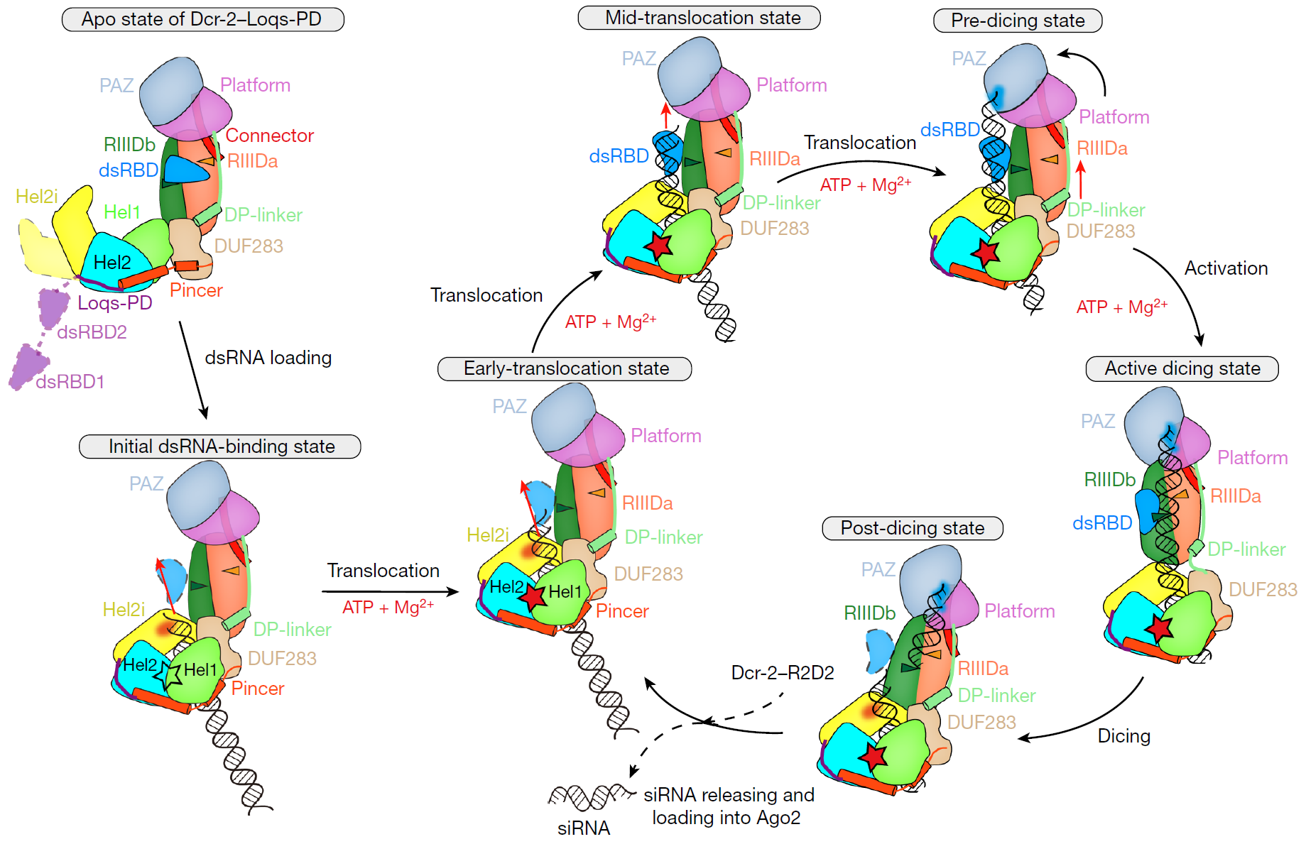 图2. Dicer-2–Loqs-PD复合物结合双链RNA蛋白生成siRNA的加工循环过程机制模型。