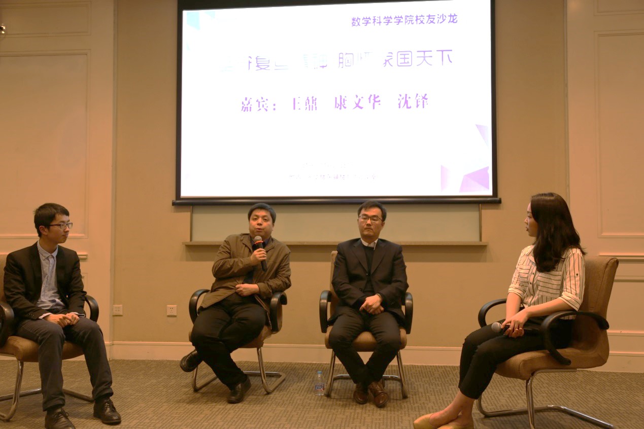 11月20日,数学科学学院举行“坚守复旦精神,胸怀家国天下”专题校友沙龙,邀请上海市发改委产业处处长王鼐(2005届校友)、上海市长宁区宣传部副部长、文化局党委书记康文华(2007届校友)和上海市公务员局沈铎(2017届校友)回母校与学院的老师同学进行分享交流。